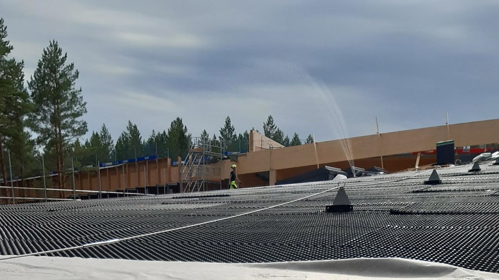 The framework structure of the roof with a pitch of between 0° and 20° consists of laminated wood beams with free spans of 24 m. Wood fibre was used for the insulation. The first layer of the ZinCo system build-up onto the root-resistant waterproof membrane is the Protection Mat SSM 45 and the drainage and water storage elements Floradrain FD 40-E. These 40 mm high Floradrain elements made from thermoformed recycled polyolefin store water in their cells and safely draw off excess water through their underlying channel system. This is the appropriate base for the vegetation required for areas with a greater variety of species. In addition, thanks to the full-cover installation, it provides the necessary position stability even in the areas of the roof with a greater pitch.