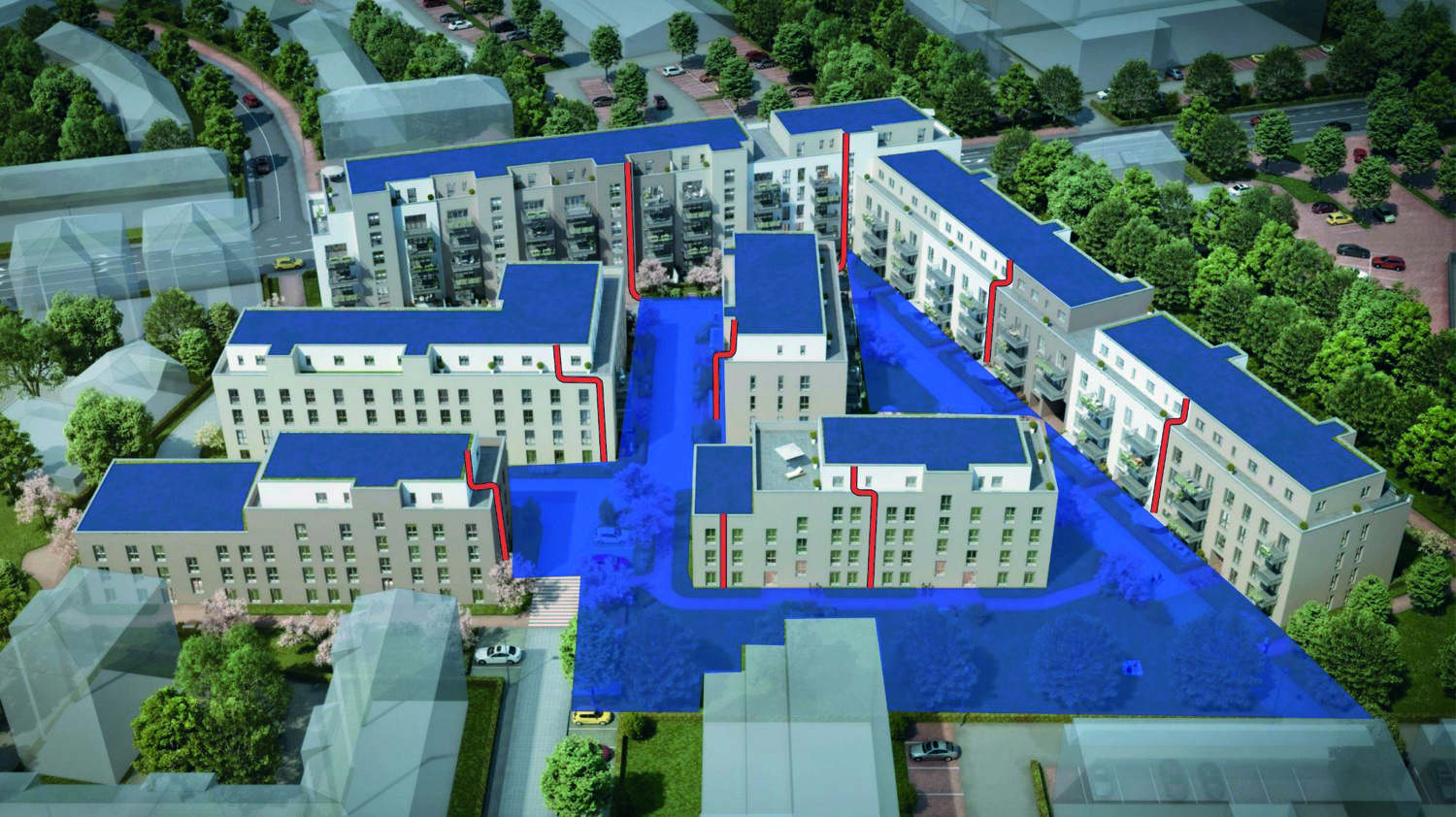 Betrachtet man nicht nur die einzelne Dachfläche, sondern ganze Wohnquartiere, gewerbliche oder öffentliche Gebäudequartiere, in denen oft Innenhöfe und Tiefgaragen gebaut werden, eröffnet sich noch größeres Potential: Stichwort Kaskadenentwässerung. Bei Tiefgaragendecken sind in der Regel eine höhere statische Last und Aufbauhöhe möglich, so dass diese problemlos als „Retentions-Gründächer“ mit großem Wasserrückhalt gebaut werden können – unsichtbar unter schönen Intensivbepflanzungen und Spiel- oder Belagsflächen. Auf diese Weise lassen sich sämtliche umliegenden Gebäudedächer mitentwässern. Je nach Bauart, ob selbst als „Retentions-Gründach“ ausgebildet, ob normal begrünt oder womöglich gar nicht begrünt, wird mehr oder weniger Überschusswasser über Fallleitungen und spezielle Kaskadenkontrollschächte in die nächste Einstauebene auf Tiefgaragenniveau übergeben und dort zwischengespeichert.