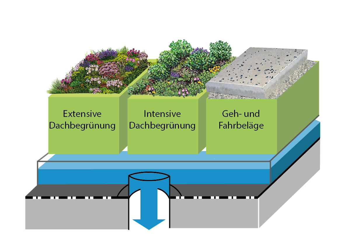 Mit diesen Aufbauten werden die steigenden Anforderungen der Klimafolgen-Anpassung berücksichtigt und gleichzeitig erweitern sie die Möglichkeiten des Wassermanagements auf und mit Dächern.