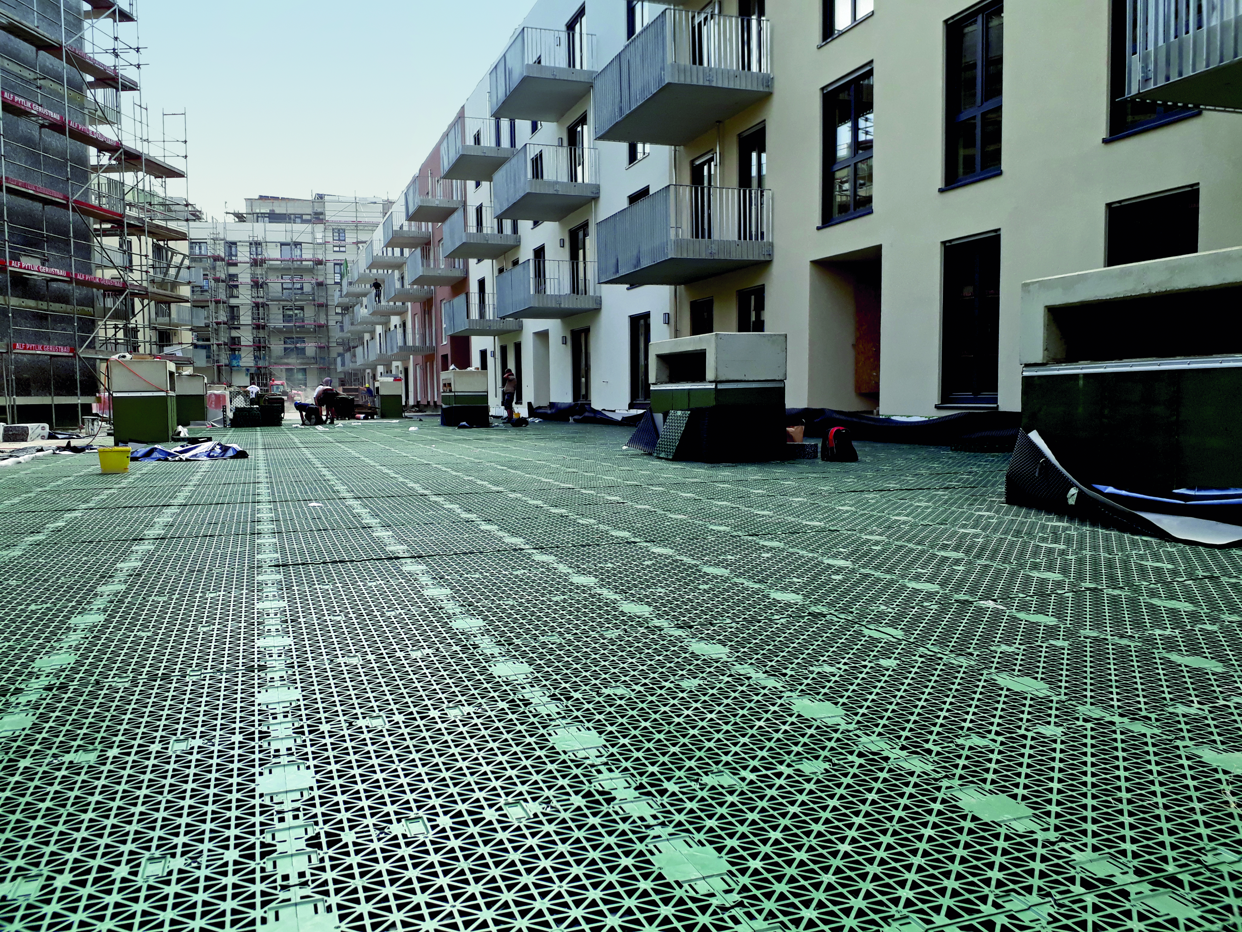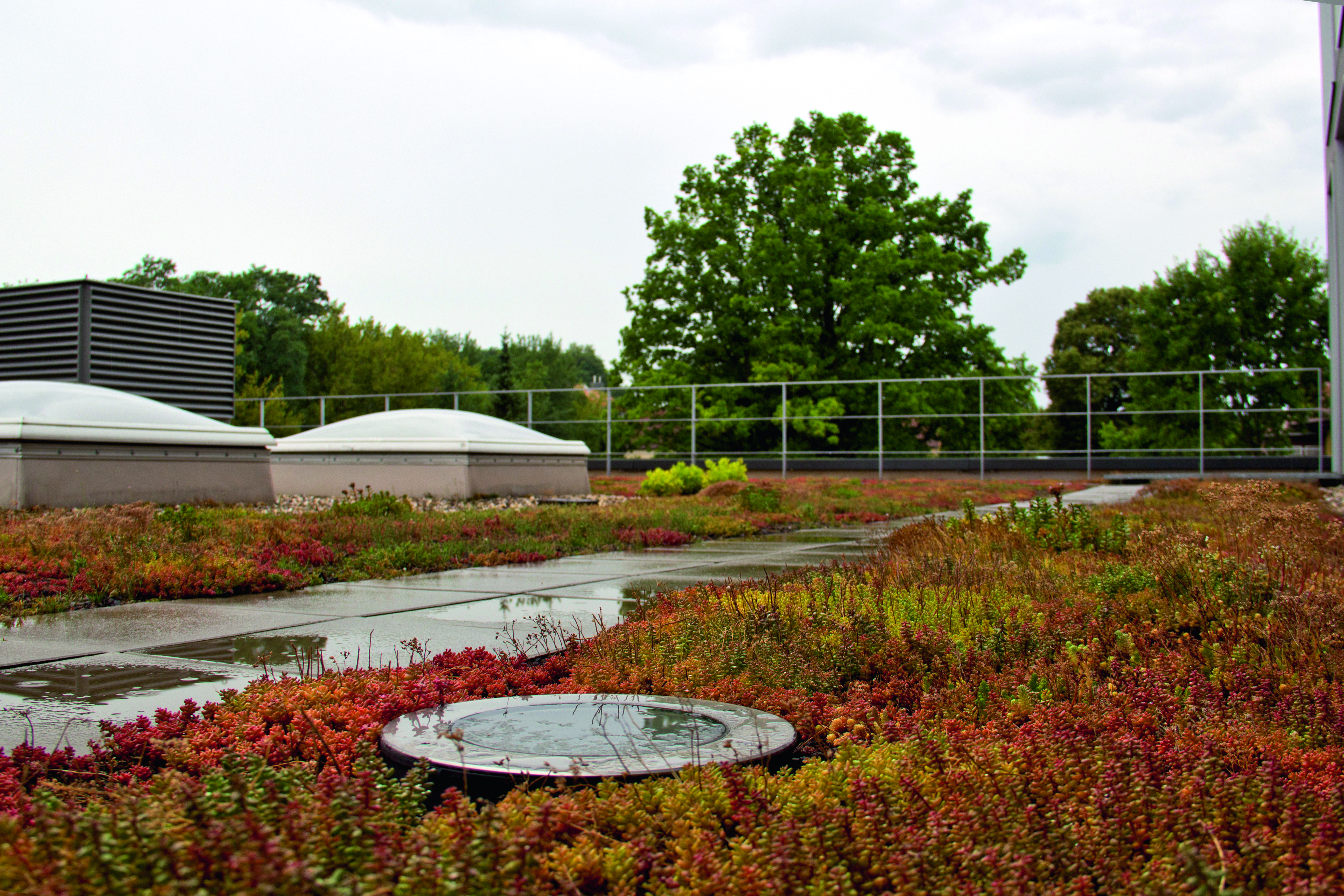 Extreme Starkregenereignisse treten immer häufiger auf und führen in unseren zunehmend versiegelten Städten zu urbanen Sturzfluten, da die Kapazitäten der bestehenden Kanalisation einfach nicht mehr ausreichen. Hilfreich ist also, Regenwasser dort aufzufangen und zwischenzuspeichern, wo es auftrifft – auf dem Dach. Das gelingt mit dem bekannten ZinCo-Systemaufbau „Retentions-Gründach“. Flachdächer und Tiefgaragendecken können als Wasserrückhaltevolumen genutzt werden und zwar unabhängig davon, ob hier eine gewöhnliche Extensivbegrünung wachsen soll oder ob eine Intensivbegrünung mit Geh-, Spiel- und Fahrbelägen oder kombinierte Nutzungsformen mit Photovoltaik gewünscht sind. Dazu wird unterhalb des eigentlichen Begrünungsaufbaus ein Rückhaltevolumen mit sogenannten Retentions-Spacerelementen geschaffen. In diesem Stauraum wird das Regenwasser gespeichert und über ein Drosselelement zeitversetzt der Kanalisation zugeführt.