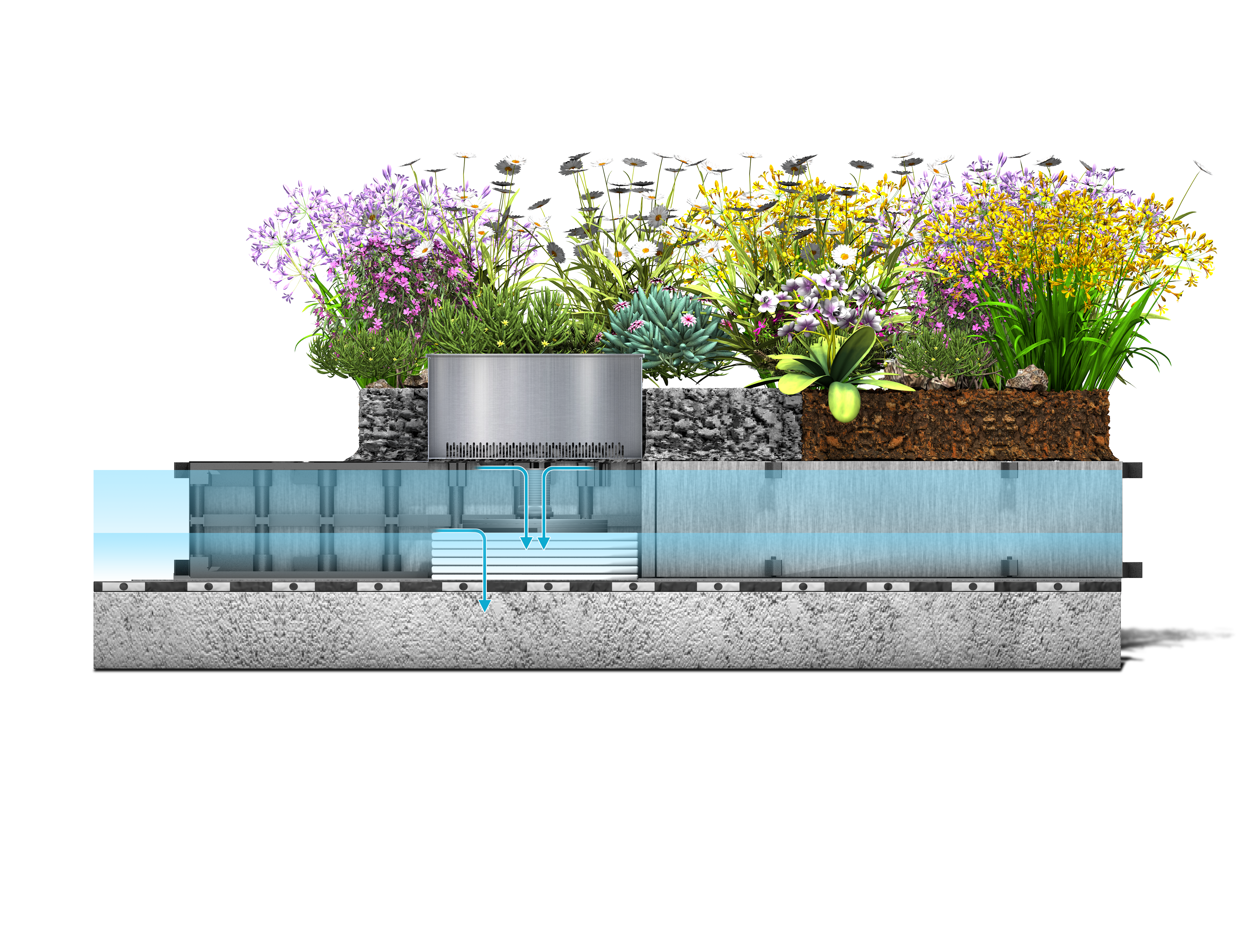Der längerfristige, pflanzenverfügbare Wasseranstau mit rund 8 cm findet im unteren Bereich des Spacers statt. Er wird mit Anstauscheiben realisiert, die unter der Retentionsdrossel liegen. Wird in Regenfällen weiter eingestaut – möglich sind weitere maximal 8,5 cm – fließt dieses Wasser über die Drossel sukzessive in den Dachablauf beziehungsweise im Idealfall in nachgeschaltete Zisternen.