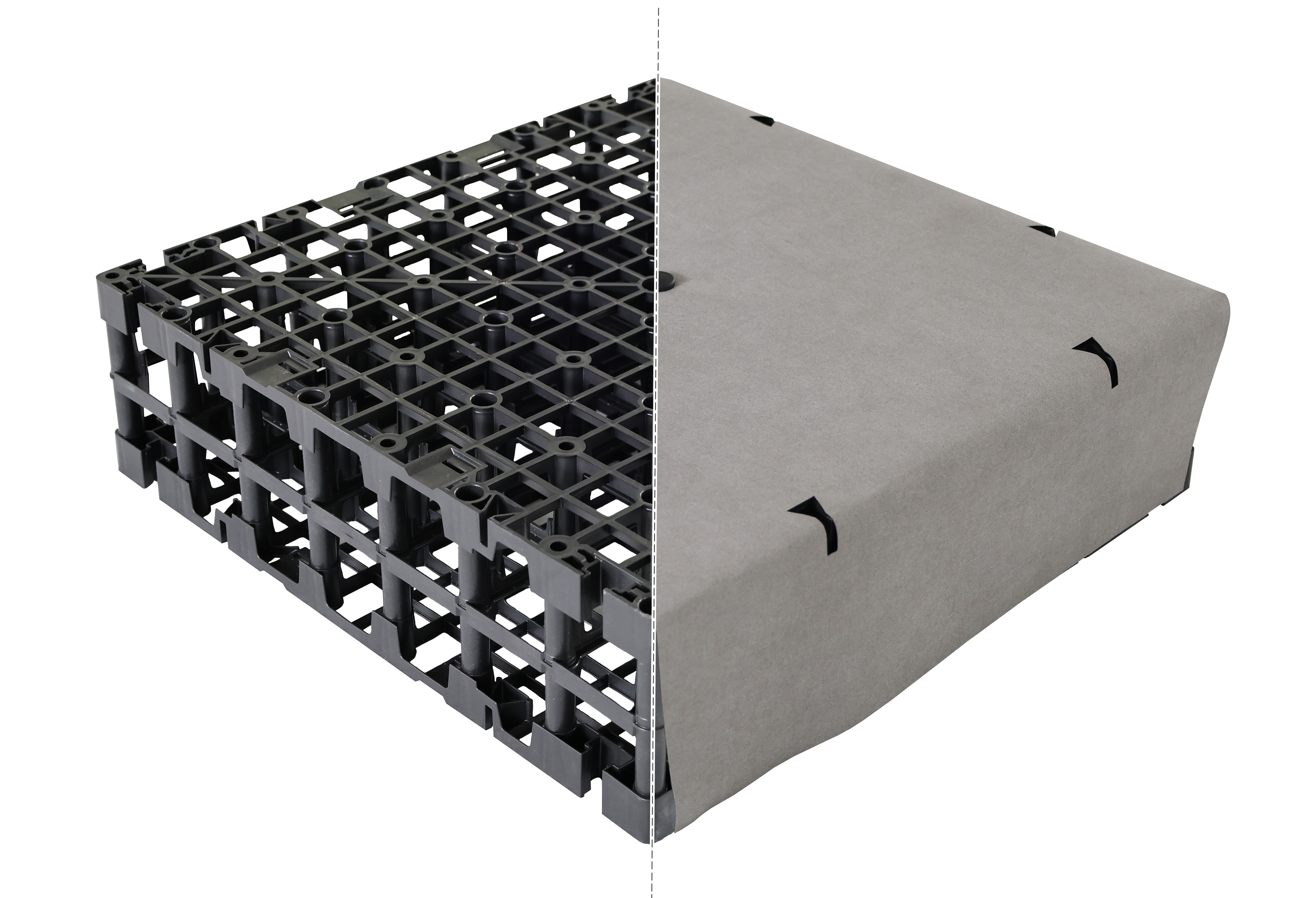 Der Wasseranstau im ZinCo-Systemaufbau „Sponge City Roof“ bedingt ein gefälleloses und fachgerecht abgedichtetes Dach. Die 60 x 60 cm großen und 17 cm hohen Elemente des HydroSpacer HS 170 aus Polypropylen verfügen über einen Hohlraumanteil von rund 95%, so dass diese bis zu 160 Liter Wasser pro m² aufnehmen können. Gleichzeitig ist die Struktur so stabil, dass sie bis zu 50 Tonnen pro m² belastbar und damit auch für Geh- und Fahrbeläge geeignet sind.