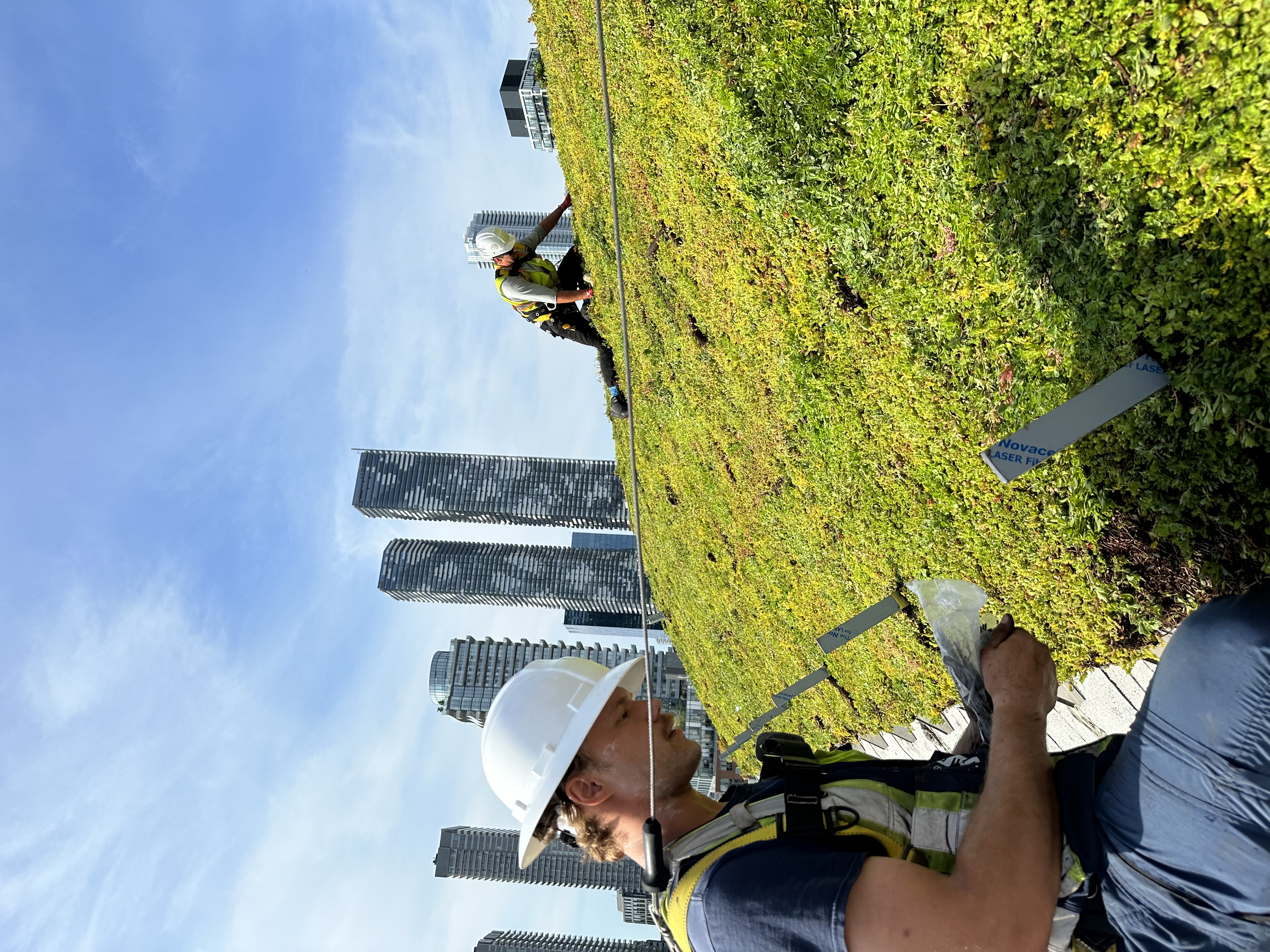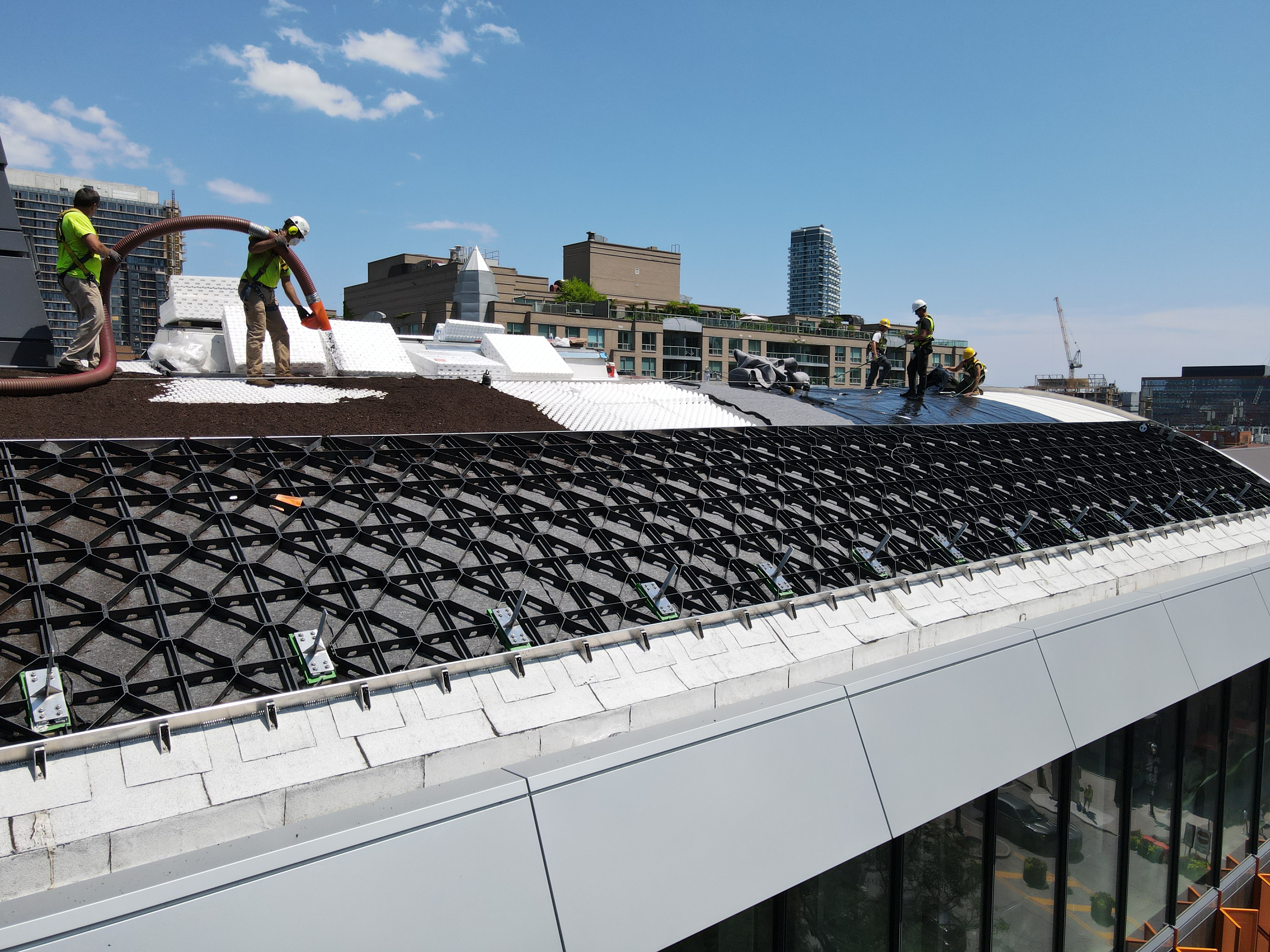 Leaf Maintenance, a Toronto-based landscaping company, completed the green roof in just a few weeks during the summer of 2023. Materials were stored in tight quarters and lifted to the roof by crane, necessitating temporary street closures. Due to frequent high winds, the installation was carried out in phases, with substrate applied immediately after the drainage layer to weigh it down. A blower truck was used to deliver the substrate directly onto the roof.