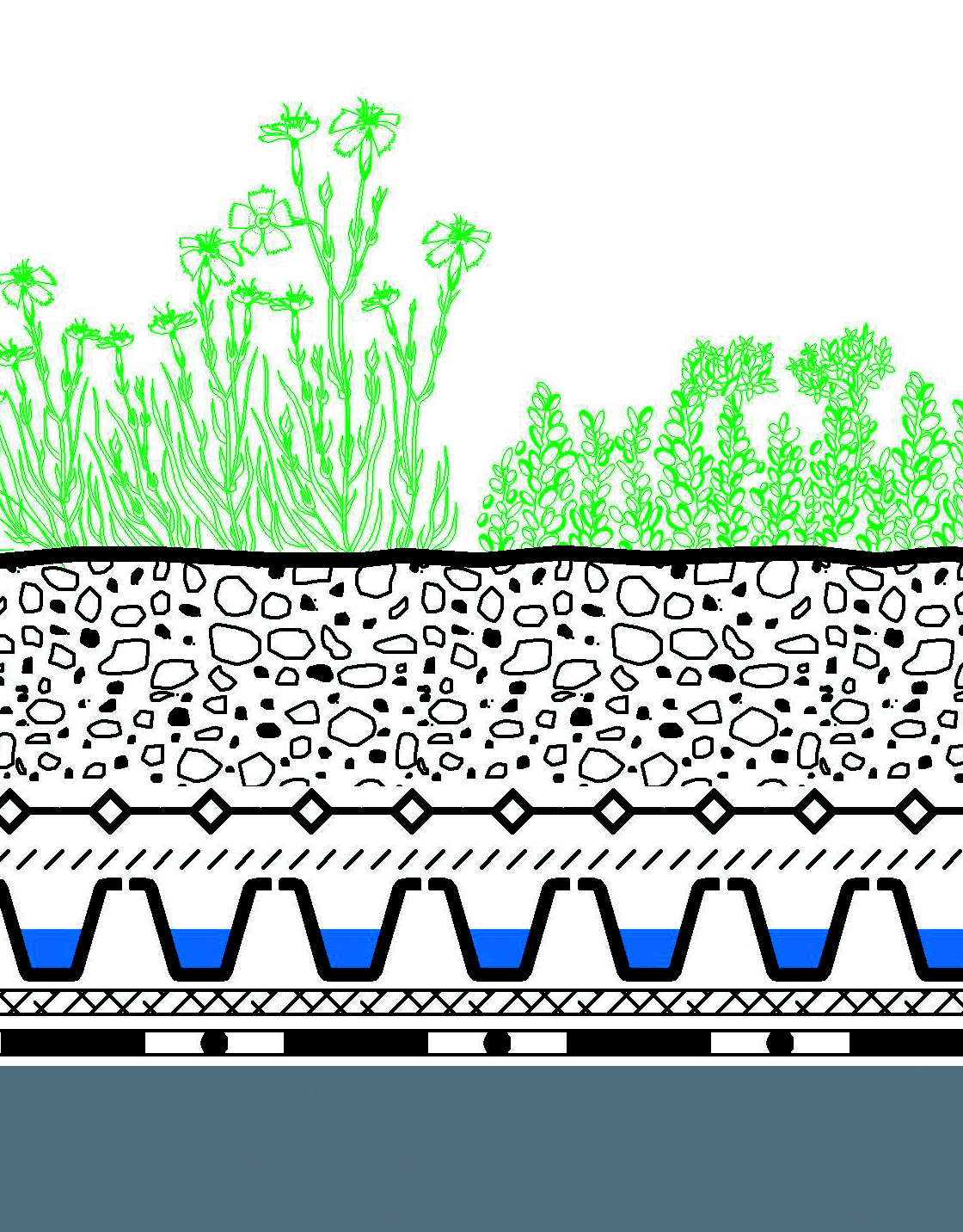 Obwohl Flachdächer in der Schweiz mit einem Mindestgefälle von 1,5 % ausgeführt werden, ist auf vielen Dachflächen stehendes Wasser vorzufinden. Durch das vollflächig verlegte Wasserspeicher- und Dränageelement Floraset® FS 75 wird der notwendige Abstand zur Substratschicht eingehalten, damit die Bepflanzung keiner Staunässe ausgesetzt ist. Diese Elemente aus Recycling-Hartschaum verfügen über Mulden zur Speicherung von Niederschlagswasser und leiten Überschusswasser zu den Dachabläufen ab. Im Systemaufbau schließt sich ein Systemfilter SF zur Abgrenzung an die darauf folgende Substratschicht Zincoterre an. Die Bandbreite der ZinCo-Pflanzengemeinschaften zur Extensivbegrünung reicht von "Sedumteppich" über "Steinrosenflur" bis zur "Blütenwiese" oder "Kräuterflur".
