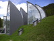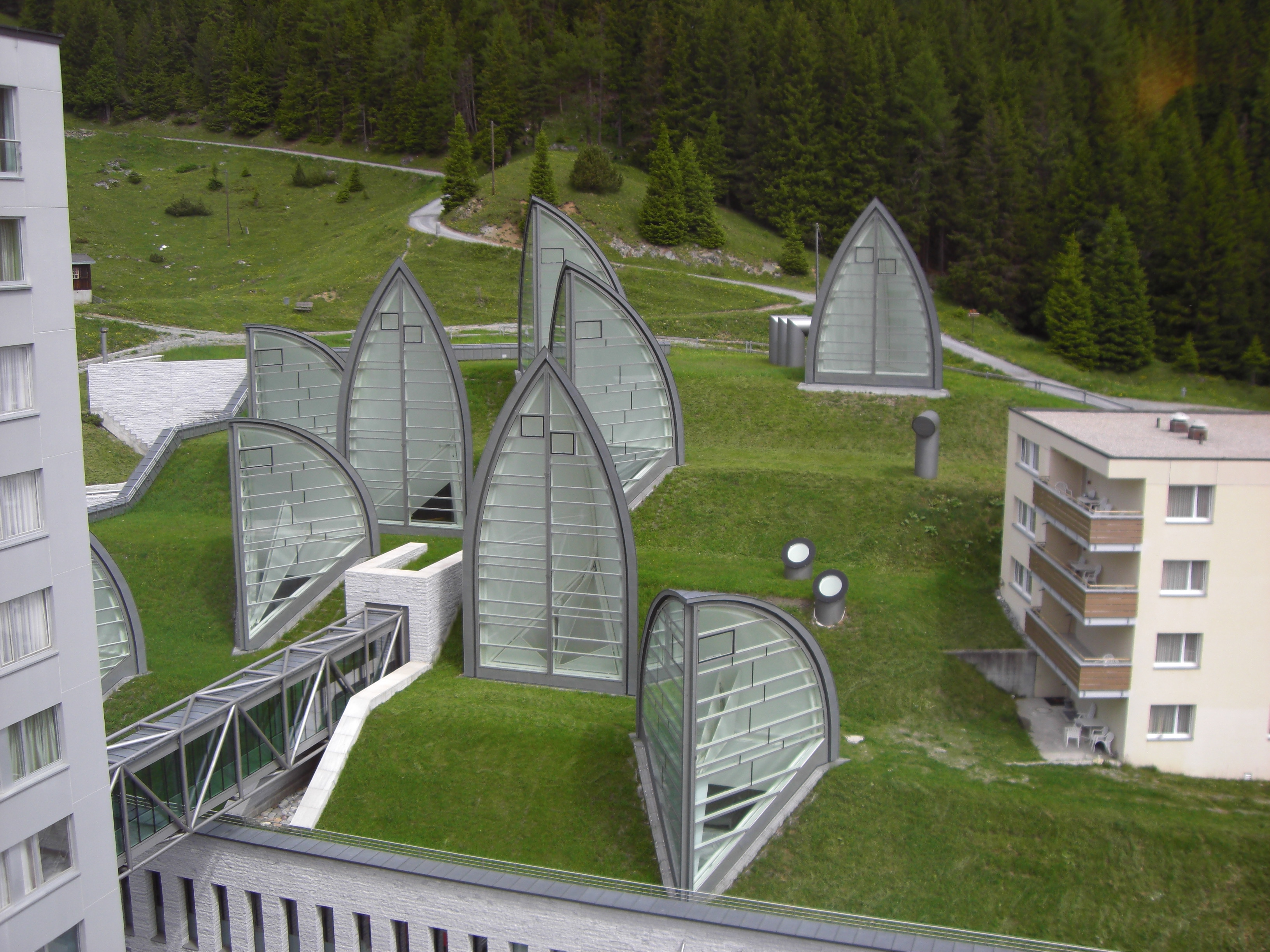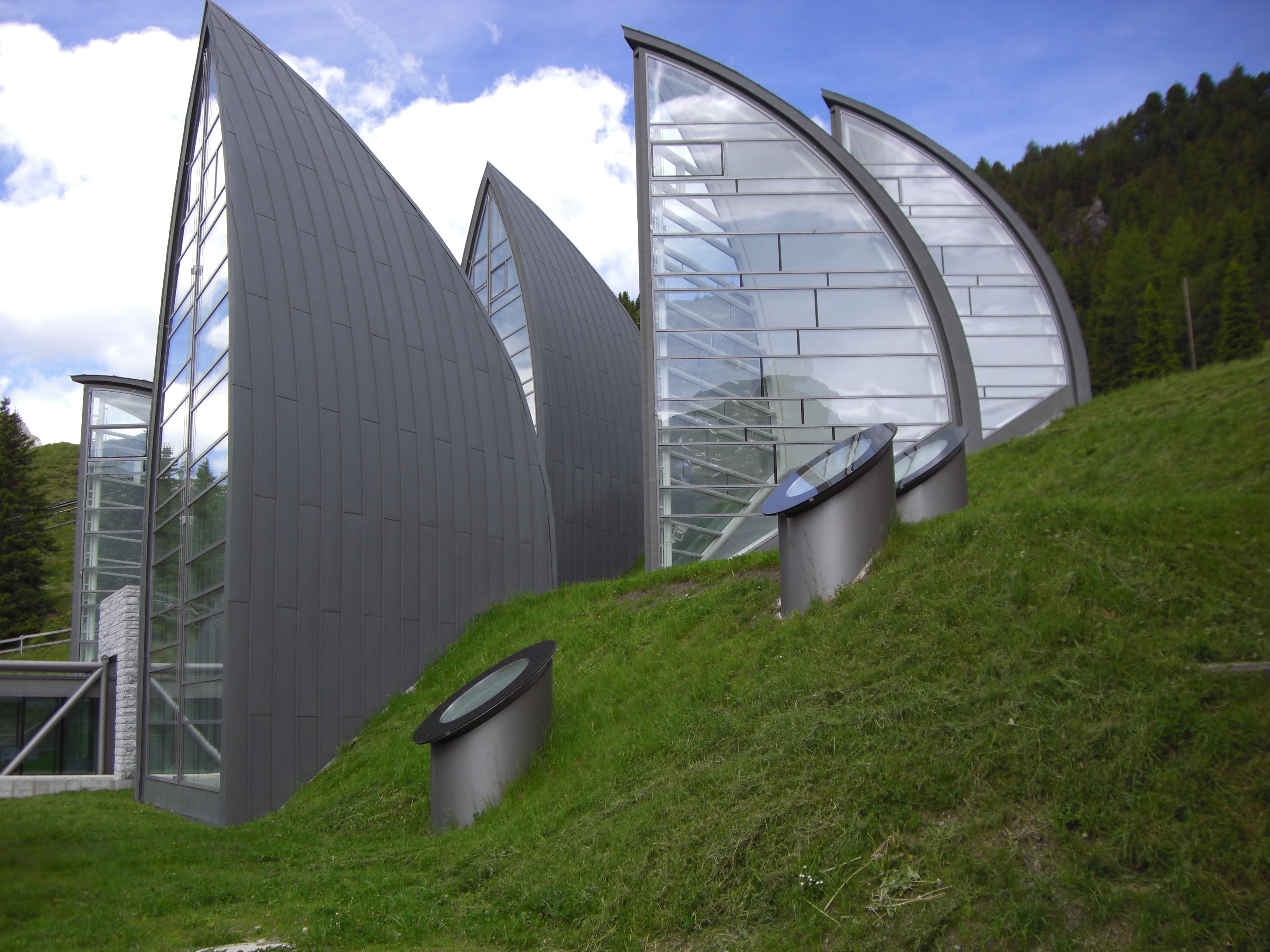 Unauffällig das Grasdach und spektakulär die geometrischen Lichtsegel -so ergibt sich ein spannungsreicher Kontrast und wie es Mario Botta formulierte "eine faszinierende Antwort von starkem Ausdruck und großem Respekt gegenüber dem umliegenden Dorf".