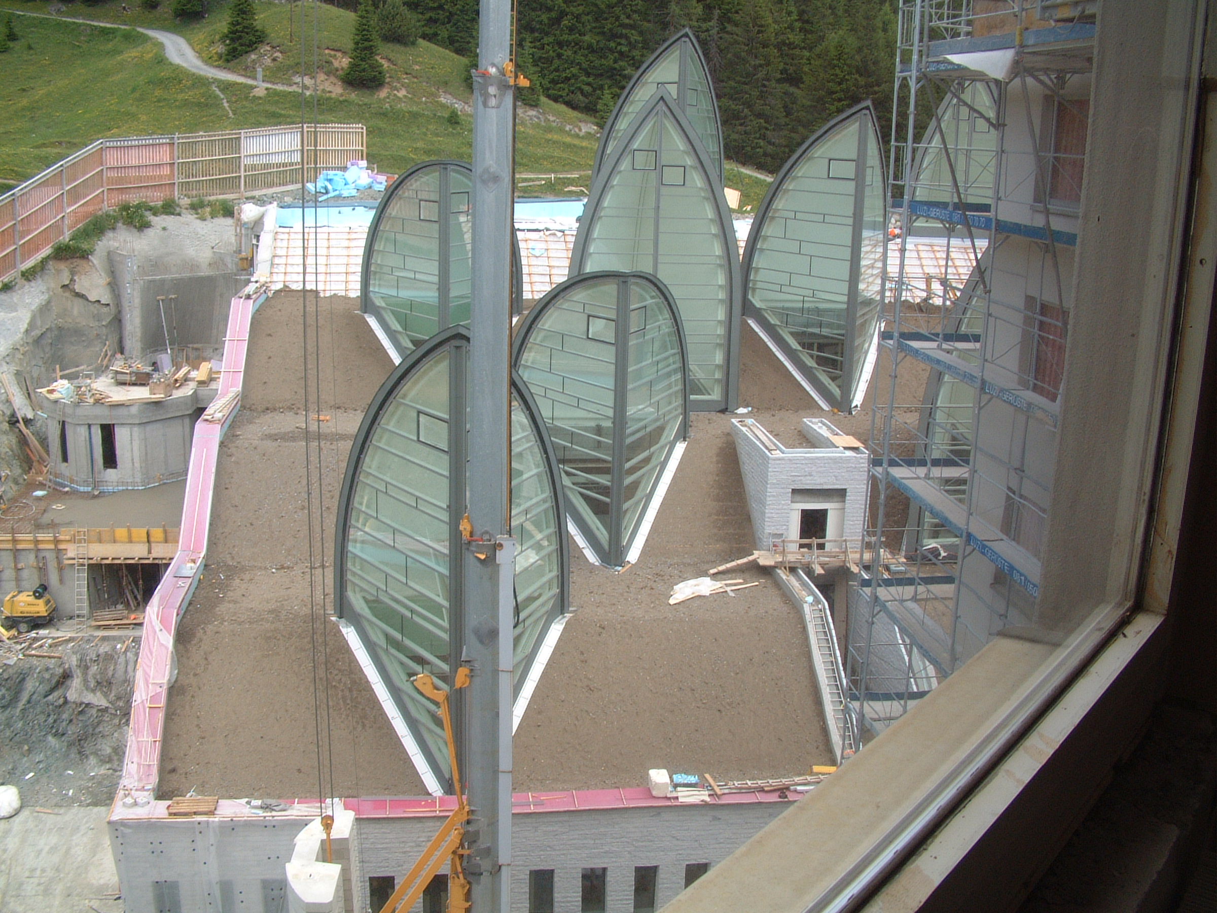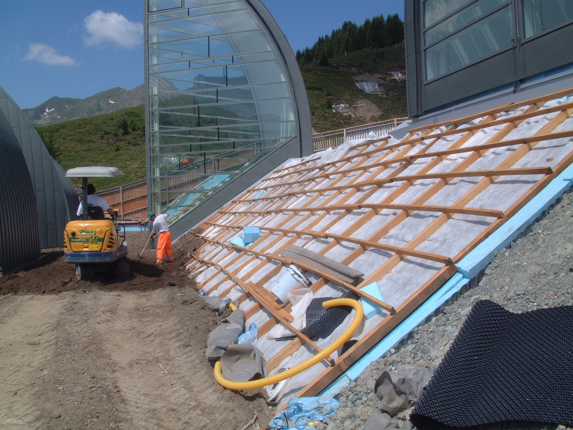 Bevor nun die Vegetationstragschicht aufgebracht werden konnte, waren in den Steildachflächen Maßnahmen zur Lagesicherung derselben notwendig. Als Erosionsschutz wurde daher mit Holzlatten eine Schubschwellenkonstruktion gebaut, die einem "Lawinenverbau" ähnelt. Unterbrochen wird diese Konstruktion lediglich durch die acht aufragenden Lichtsegel. Diese zwischen 9 und 13 m hohen, dreiecksförmigen Lichtsegel aus Glas und Stahl befinden sich nämlich alle bis auf eine Ausnahme im Steildachbereich.