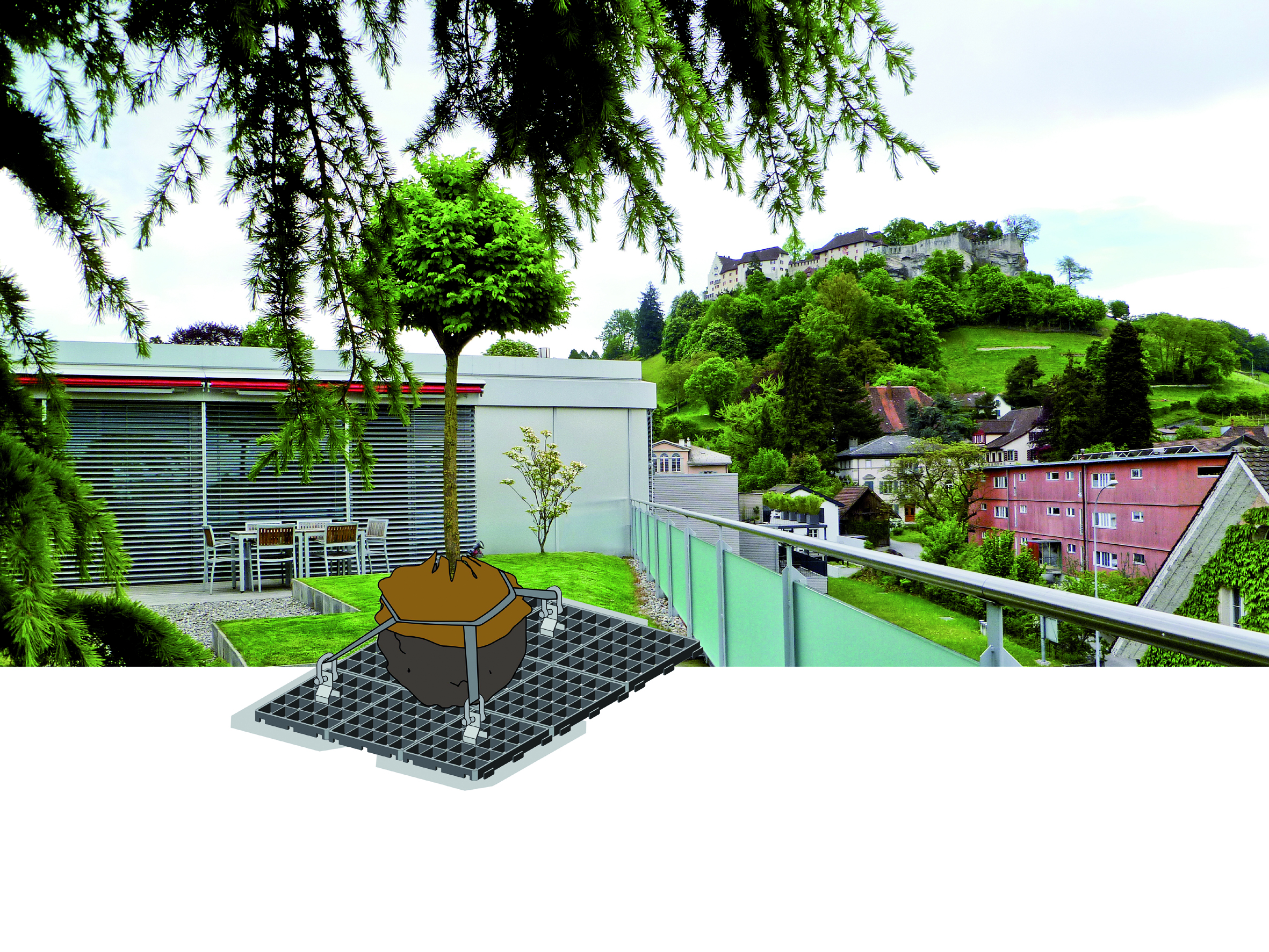 Um Bäume auf Dachflächen sicher zu verankern, kommen oft Stahlgitter zum Einsatz, an welchen der Wurzelballen mit Spannbändern gesichert wird. Die oft spitzen Kanten von zugeschnittenen Stahlgittern können allerdings die Dachhaut gefährden. Nicht so bei der neuen Baumverankerung Robafix von ZinCo.