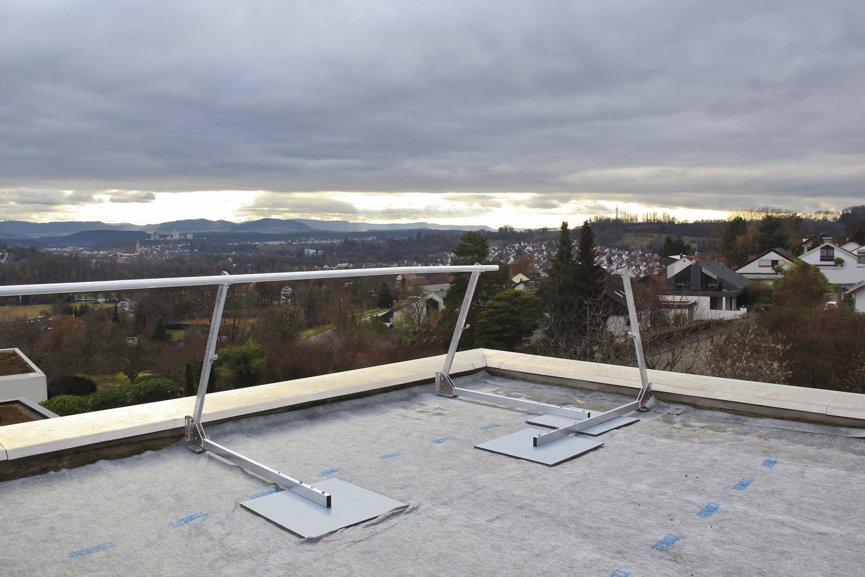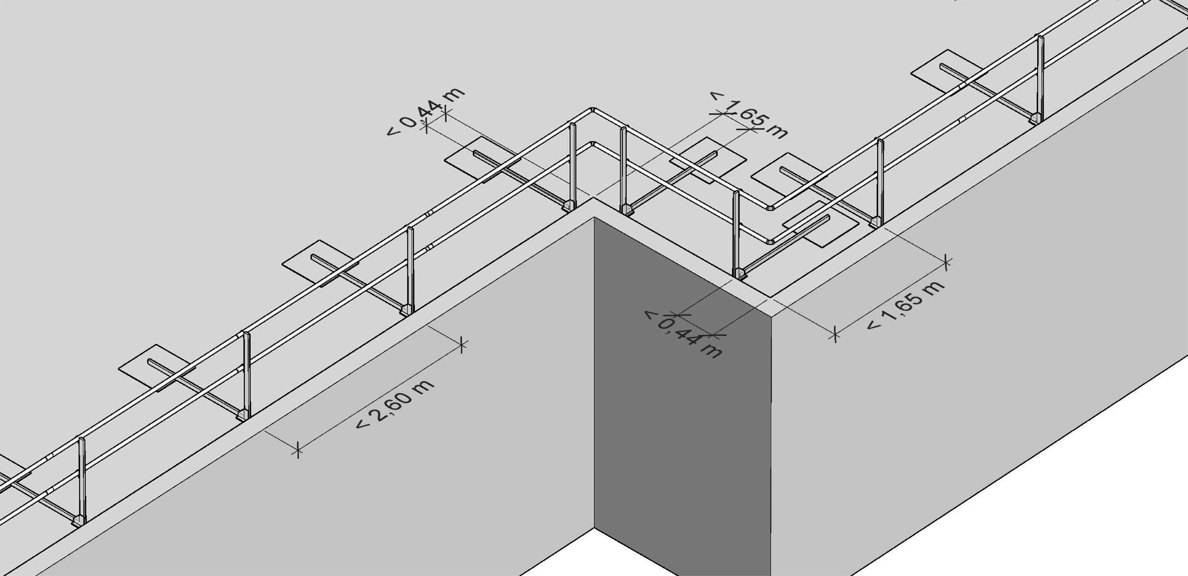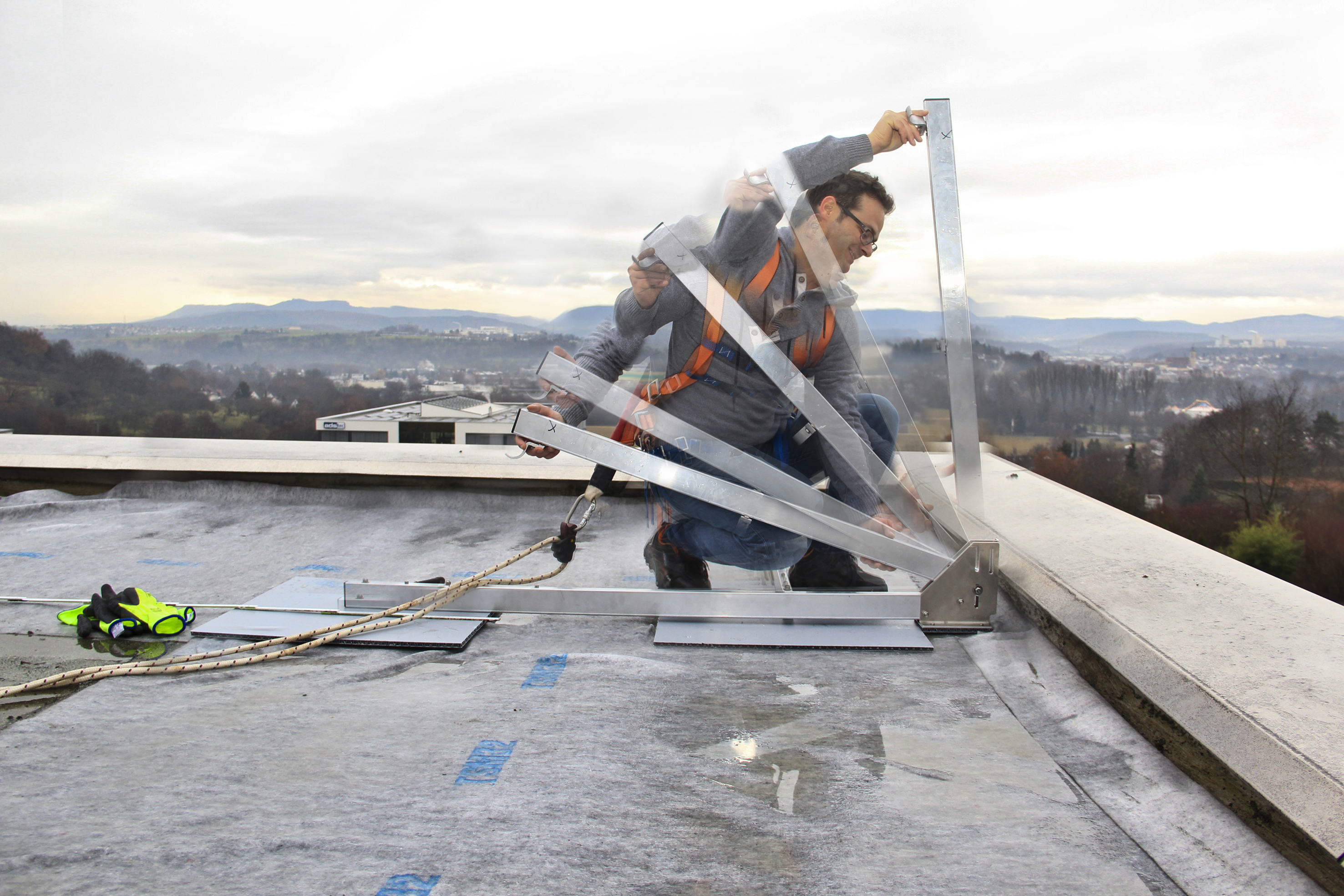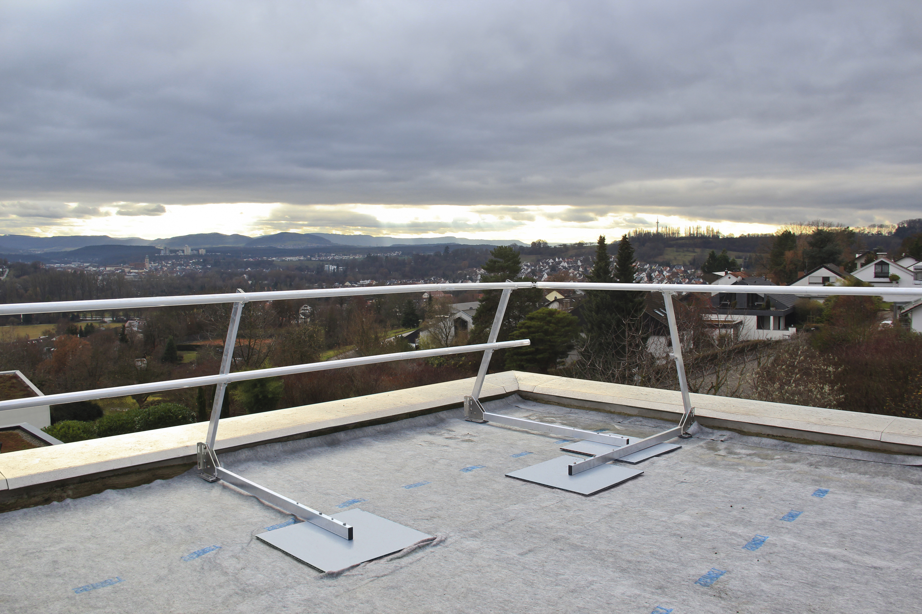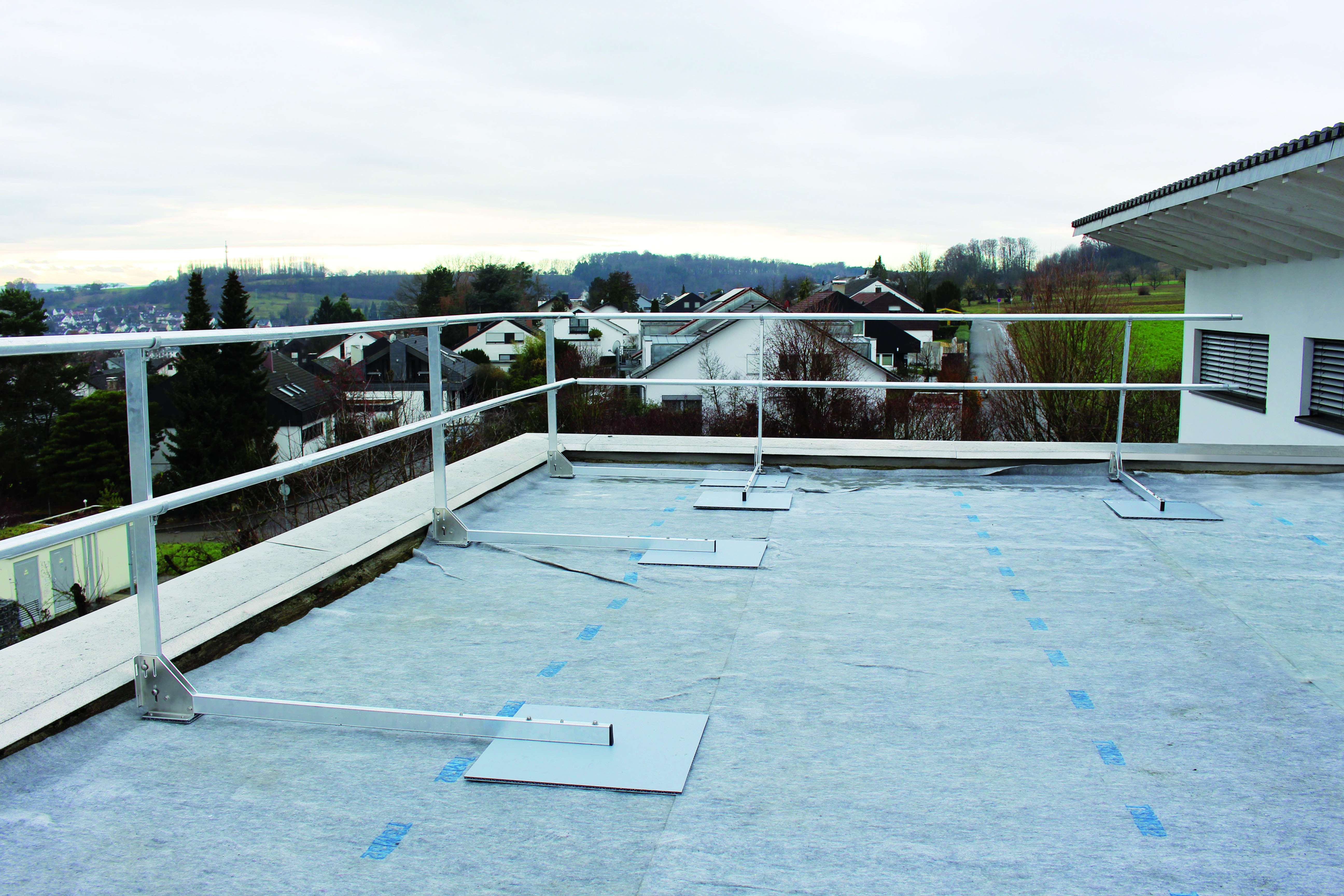 Zunächst werden die Pfostenmodule der Geländerkonstruktion im Abstand von maximal 2,60 Meter auf einer Schutzmatte ausgelegt. Dann wird der bereits vormontierte Geländerpfosten lediglich noch nach oben geklappt und in der gewünschten Pfostenstellung von 90° beziehungsweise 67,5° Neigung fixiert. Im Anschluss können die Pfosten bereits mit den Geländerholmen und den Zwischenholmen bestückt werden. Dazu werden diese mittels integrierten Stoßverbinders ineinandergesteckt und mit Bohrschrauben fixiert. Auf die gleiche Weise werden die flexiblen Eckverbindungen montiert, welche das Geländer im Bedarfsfall über Eck führen. Die Geländerpfosten sind direkt an die Attika (Attikahöhe mindestens 50 mm) zu schieben. Beträgt der Abstand vom Zwischenholm zur Attika mehr als 470 mm, sind Bordbretter zu montieren.
